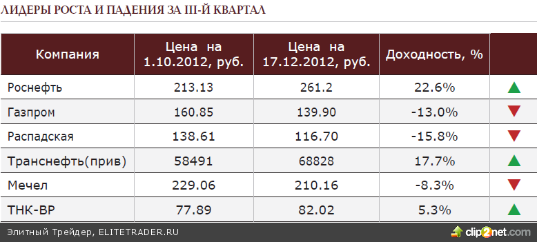 Наилучшую динамику в 3 квартале показали акции «Роснефти» и «Транснефти». Первая отыгрывала возможную синергию от объединения с ТНК-BP, а «Транснефть» (к слову обладающей заметным потенциалом) – увеличение пошлины на транспортировку нефти и планы правительства по приватизации компании в ближайшие годы. Хуже рынка по недоброй традиции были «Газпром» (не любят его западные инвесторы) и «Распадская» («Евраз» расстался с идеей продать кому-нибудь этот актив и будет восстанавливать шахту самостоятельноa
