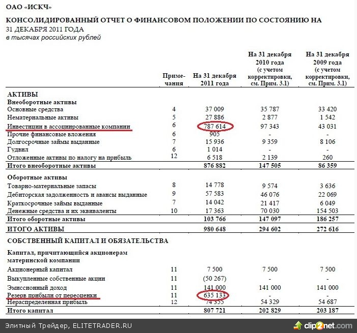 Показатель ROE за 2010-2011 гг. компания не очень красиво выглядит 3,69% и 9,02%. И еще один момент у данной компании – это размер собственного капитала (BV) на конец 2011 года – 807,7 млн. руб., сейчас капитализация 956,6 млн. руб. и получается коэффициент P/BV=1,18. Кажется, что даже дешево. Но посмотрим в баланс и что мы видим из 807,721 млн. руб. собственного капитала 635,133 млн. руб. – это «Резерв прибыли от переоценки». Вот что это такое, прибыли нет, просто деньги из воздуха!!!??? И соответственно выросла статья активов баланса «Инвестиции в ассоциированные и прочие компании». Что произошло?