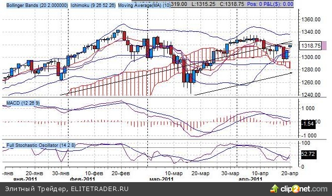 Индикатор Ишимоку отражает наличие среднесрочного понижательного тренда, так как ключевые средние индикатора, образовавшие область поддержки на 1290-1310 пунктов, находятся в медвежьем пересечении. Быстрая скользящая средняя направлена горизонтально, а медленная понижательно – признак коррекции тренда, при этом котировки все еще торгуются выше Облака Ишимоку.