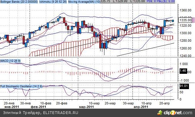Индикатор Bollinger Bands сигнализирует о развороте от нижней границы среднесрочного динамического канала на 1300 пунктов, текущая верхняя граница проходит через уровень 1335 пунктов, при этом котировки практически достигли верхней границы.