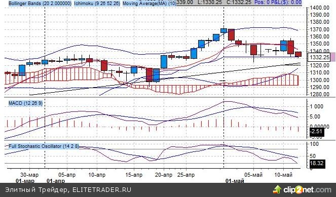 Согласно теории волн Элиота, в настоящее время отмечаем коррекцию внутри повышательного цикла. Максимум первой волны – 1315 пунктов от 21 апреля. После непродолжительного периода консолидации котировки устремились к новому уровню сопротивления на 1370 пунктов от 29 апреля. Ориентиром для коррекции выступил уровень 1320 пунктов – повышательный уровень поддержки. Текущее движение можно классифицировать как повышательное и коррекционное.