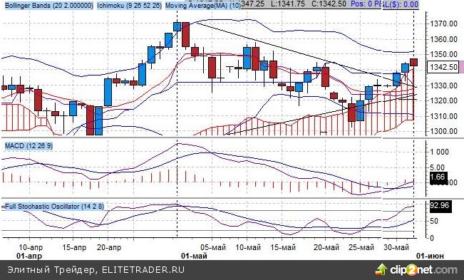 Индикатор Bollinger Bands сигнализирует о развороте от нижней границы среднесрочного динамического канала на 1310 пунктов, техническая цель – верхняя граница, которая проходит через уровень 1350 пунктов.
