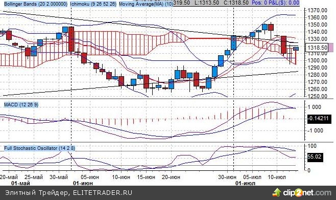 Индикатор Bollinger Bands сигнализирует о развороте от верхней границы среднесрочного динамического канала на 1350 пунктов, техническая цель – нижняя граница канала, которая проходит через уровень 1300 пунктов.