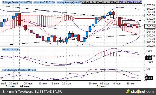 Индикатор Ишимоку отражает наличие среднесрочного повышательного тренда, так как ключевые средние индикатора, образовавшие поддержку на 1300 пунктов, находятся в бычьем пересечении. Быстрая скользящая средняя направлена понижательно, медленная – горизонтально – признак коррекции тренда, при этом котировки находятся внутри Облака Ишимоку. Техническая цель – 80% от ширины Облака – уровень поддержки на 1290 пунктов.