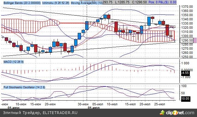 Индикатор Bollinger Bands сигнализирует о реализации разворота к нижней границе среднесрочного динамического канала на 1290 пунктов – техническая цель и сигнал для завершения продаж.
