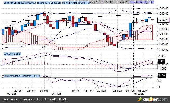 Индикатор Bollinger Bands сигнализирует о покупках от основания на 1150 пунктов. Ориентиром для роста выступает уровень 1280 пунктов.