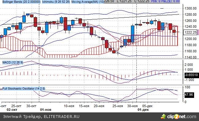 Отмечаем реализацию продаж до горизонтального уровня поддержки на 1217 пунктов. Котировки вышли вниз из консолидации на уровне 1250 пунктов, приоритет пока за продажами, но сохраняется возможность роста до уровня сопротивления на 1280 пунктов при восстановлении выше уровня 1260 пунктов.