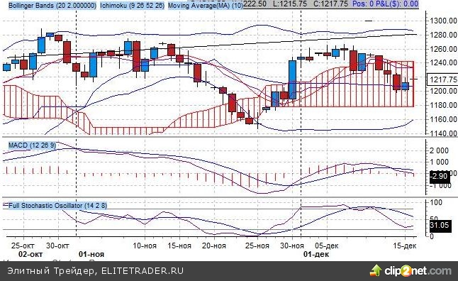 Отмечаем реализацию продаж до горизонтального психологического уровня поддержки на 1200 пунктов. Котировки вышли вниз из консолидации на уровне 1250 пунктов, приоритет пока за продажами, но сохраняется возможность роста до уровня сопротивления на 1280 пунктов при восстановлении выше уровня 1260 пунктов.