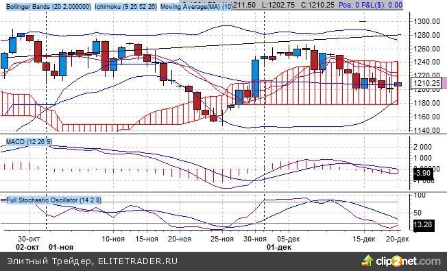 Индикатор Bollinger Bands сигнализирует об окончании продаж у основания на 1200 пунктов. Ориентиром роста выступает уровень 1260 пунктов.