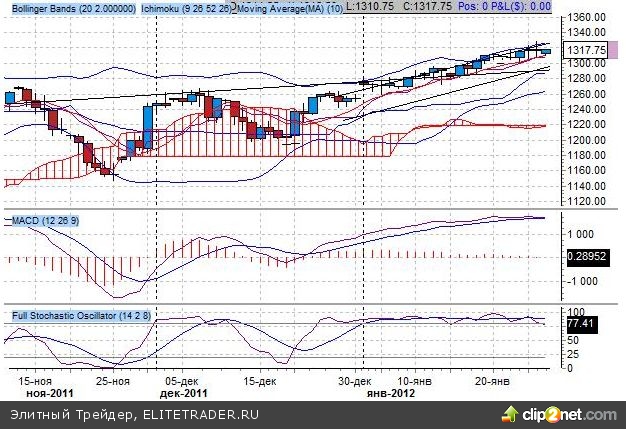 Индикатор Bollinger Bands сигнализирует о выражении покупок вблизи уровня 1325 пунктов. Ожидаем разворот котировок вниз от текущей верхней границы до нижней границы канала на 1260 пунктов.