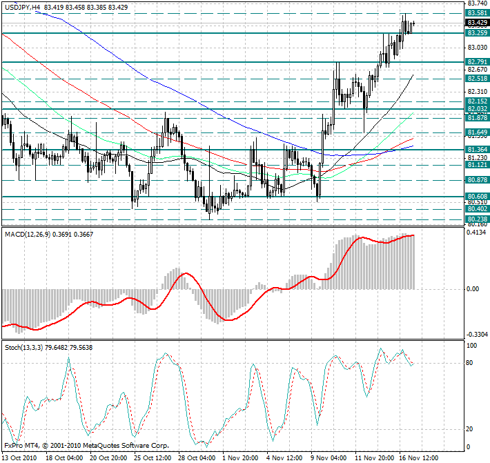 Уже возле уровня 83.60 рост доллар/йены замедлился и началась консолидация в ценовом диапазоне 83.25-83.60, которая продолжается до сих пор...