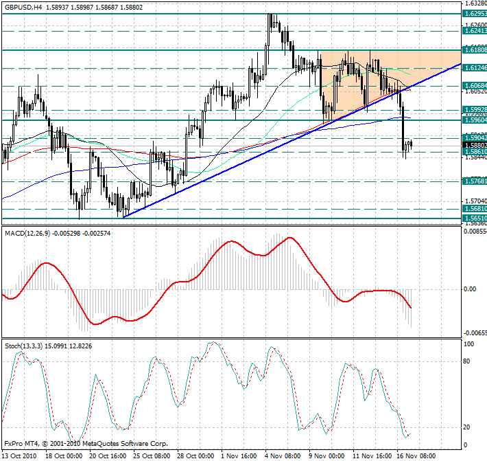 Обратив внимание на 4х часовой график, можно заметить, что на торгах во вторник была пробита нижняя граница ранее сформированного восходящего треугольника, что привело к усилению медвежьих настроений и ранее намеченные цели 1.5990 и 1.5960 были отработаны в самом начале американской сессии.