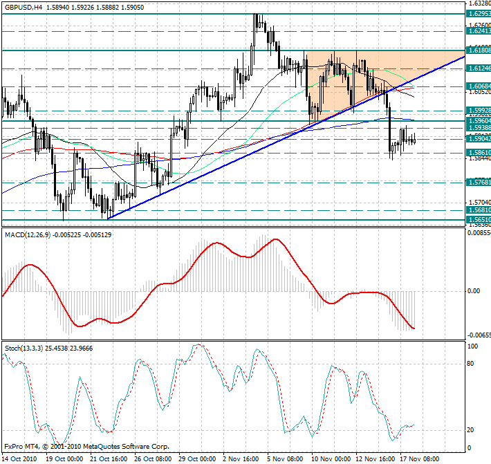 Курс валюты по-прежнему расположен ниже скользящих средних с периодами 144, 34, 89 и 55, которые являются рядом уровней сопротивления 1.5960, 1.6040 и 1.6070.