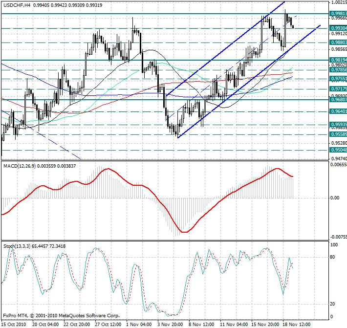 Обратив внимание на 4х часовой график, можно заметить, что на торгах в четверг быкам не хватило сил для пробоя сильного уровня сопротивления 0.9900/10 и курс валюты начал консолидироваться в рамках относительно узкого ценового диапазона 0.9840-0.9910...