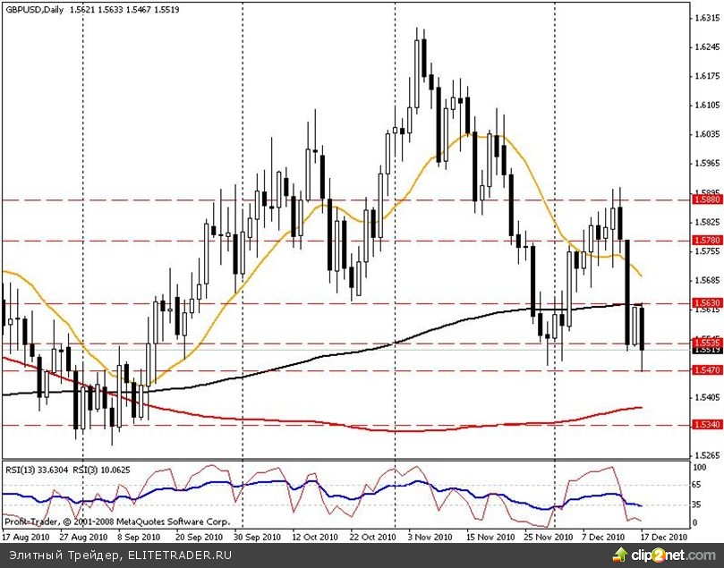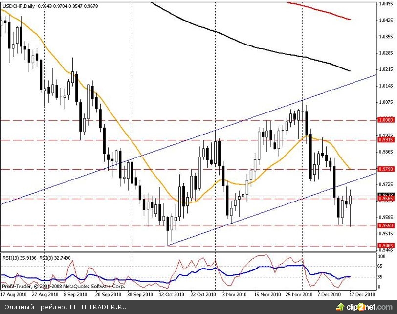 На прошедшей неделе пара пробила нижнюю границу восходящего ценового канала построенного по минимумам 14 октября и 5 ноября, а так же максимуму 1 ноября 2010 года. Ключевым для пары является диапазон 0,9665 – 0,9790. В случае пробития 0,9790 пара может вырасти до 0,9915, а далее возможно продолжение роста до отметки 1,0000. В случае же пробития 0,9665 пара вновь проверит на прочность отметку 0,9550, а далее может снизиться к историческому минимуму в районе 0,9465. Скользящие средние на недельном, дневном и четырехчасовом графиках указывают на снижение пары. RSI на недельном, дневном и четырехчасовом графиках нейтрален. Мы по-прежнему занимаем бычью позицию по данной валютной паре, ожидая положительной динамики в самое ближайшее время и рекомендуем ее к покупке при попытке прорыва отметки 0,9665.