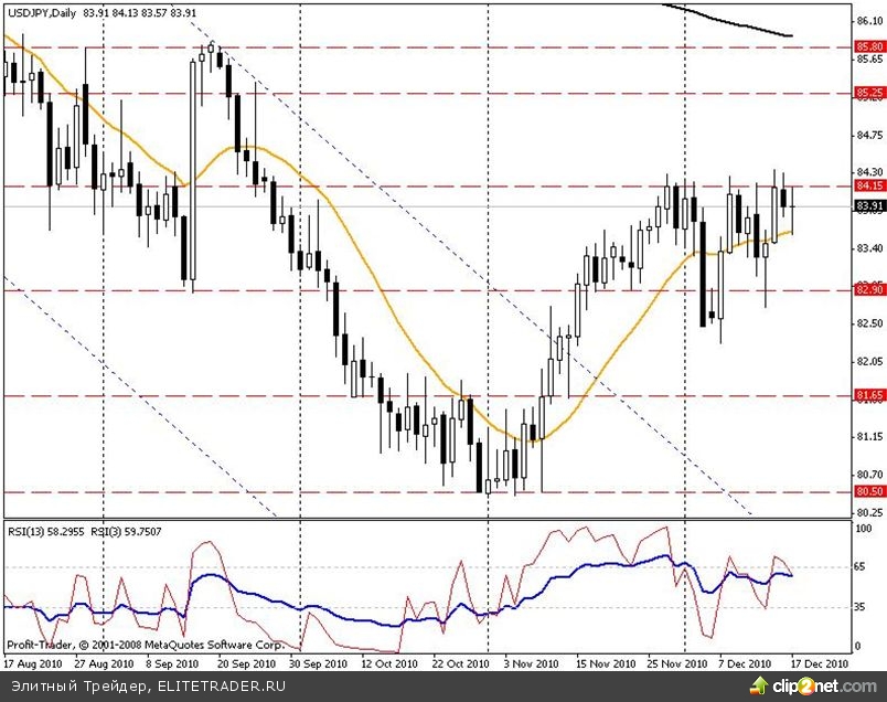 На прошедшей неделе пара отыграла падение первой рабочей недели декабря. Ключевым для пары является диапазон 82,90 – 84,15. В случае пробития 84,15 пара вырастет к 85,25, а далее направиться к 85,80. В случае пробития отметки 82,90 пара может проверить на прочность отметку 81,65, а далее может снизиться к отметке 80,50. Скользящие средние на недельном и дневном графиках указывают на нисходящее движение, а на четырехчасовом таймфрейме индикатор указывает на рост пары. RSI на недельном, дневном и четырехчасовом таймфреймах нейтрален. Мы занимаем бычью позицию по данной валютной паре и рекомендуем ее к покупке при попытке прорыва к 82,90.