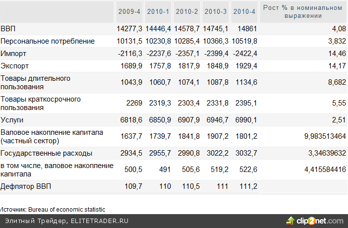 Итак, ВВП вырос в номинальном выражении с 14 277,3 млрд. в 4-м квартале 2009 года до 14 861 в 4-м квартале 2010 года.