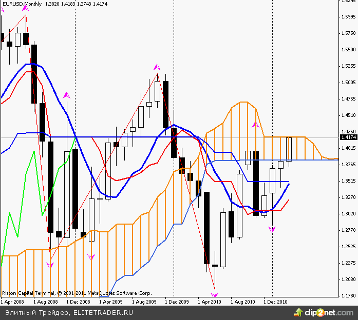 Технически, евро/доллар продолжает дальнейший рост, закрыв неделю выше 1.4100, угрожая продолжить мощный двухмесячный восходящий тренд. Сейчас сопротивление лежит в верхней части облака Ишимоку на месячном графике - 1.4185. Скопления поддержек между 1.3980 и 1.4035 не позволяет медведям надеяться перехватить инициативу...