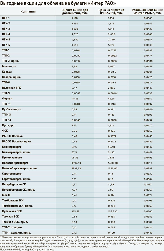 Акционеры-«преимущественники» имеют право оплатить допэмиссию «Интер РАО» не только деньгами, но и бумагами. 28 декабря энергохолдинг представил оценку активов для внесения их в уставный капитал в рамках «второй» допэмиссии. Исходя из этого, я провел пару простых арифметических действий и составил таблицу, по которой можно понять, какие акции выгодно менять на «Интер РАО», а какие нет.