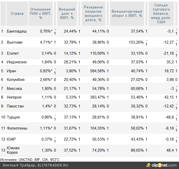По результатам расчетов можно выявить двух явных лидеров: Нигерию и Южную Корею, хотя последняя относится к развитым странам и, по мнению экспертов WOC, не совсем корректно сравнивать её с развивающимися странами. "Корея уже стала членом ОЭСР и сегодня является более процветающей и развитой страной, чем многие страны Евросоюза, - отмечает Сергей Гуриев. - Тем не менее, у Кореи много общего со странами BRICS: это быстрорастущая экономика, которая, очевидно, будет играть ключевую роль в мировой экономике. По схожим причинам следующими кандидатами являются Мексика, Аргентина и Чили".