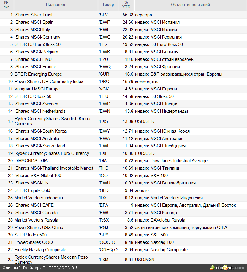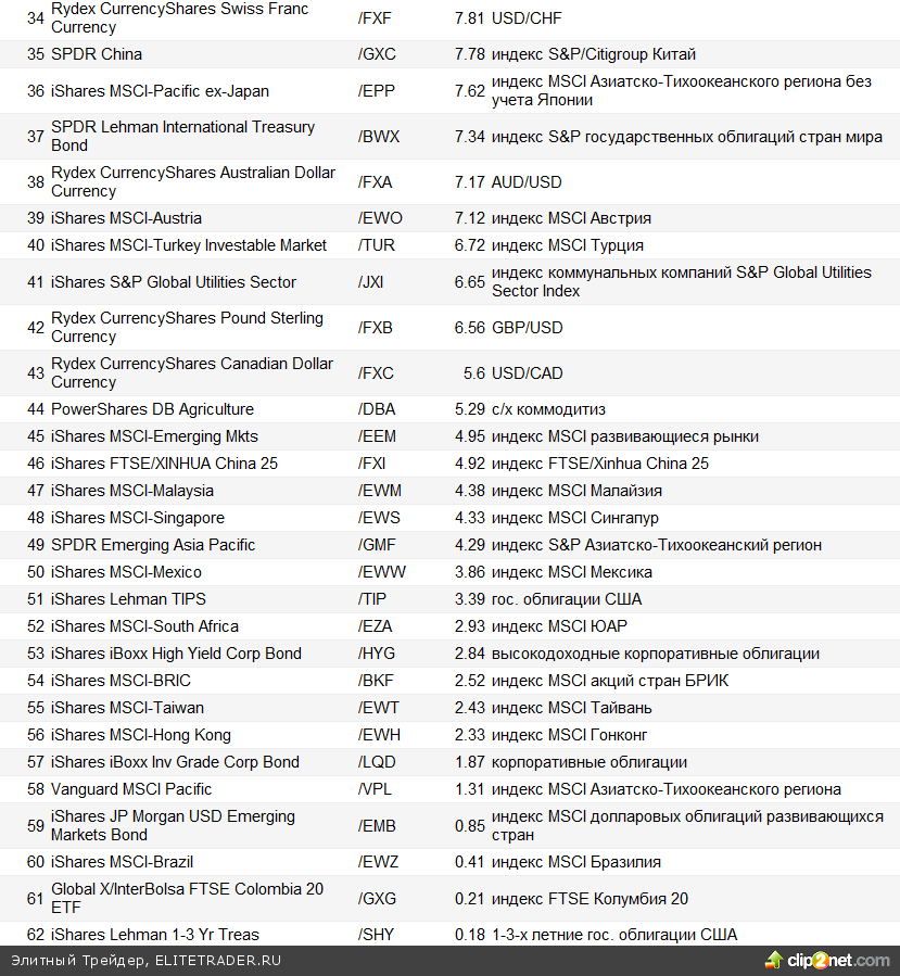 На данный момент существует более 1000 различных ETF в США, и их количество продолжает увеличиваться. Сейчас можно встретить ETF, относящиеся к различным сегментам финансового рынка: рынку акций, облигаций, биржевых товаров (коммодитиз) и валюты. Нижеприведенная таблица отражает доходность основных ETF с начала 2011 года: