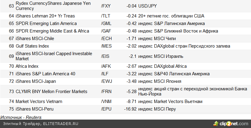 Как и в прошлом месяце, лидером нашего рейтинга ETF по доходности в апреле стал инструмент с привязкой к серебру - его доходность за период с начала года превысила 55%. В последние месяцы драгоценные металлы пользовались повышенным спросом на фоне событий в Японии и на Ближнем Востоке. Серебро характеризуется гораздо большей волатильностью, чем золото, и ETF с привязкой серебру стремительно обогнал фонд с привязкой к желтому металлу по доходности (для сравнения, фонд SPDR Equity Gold с начала года прибавил лишь 9,8%). Как мы уже отмечали, на наш взгляд, молниеносный и агрессивный рост цен на серебро должен прерваться на закономерную передышку - серебру необходима техническая коррекция, поскольку рынок накалился до предела.