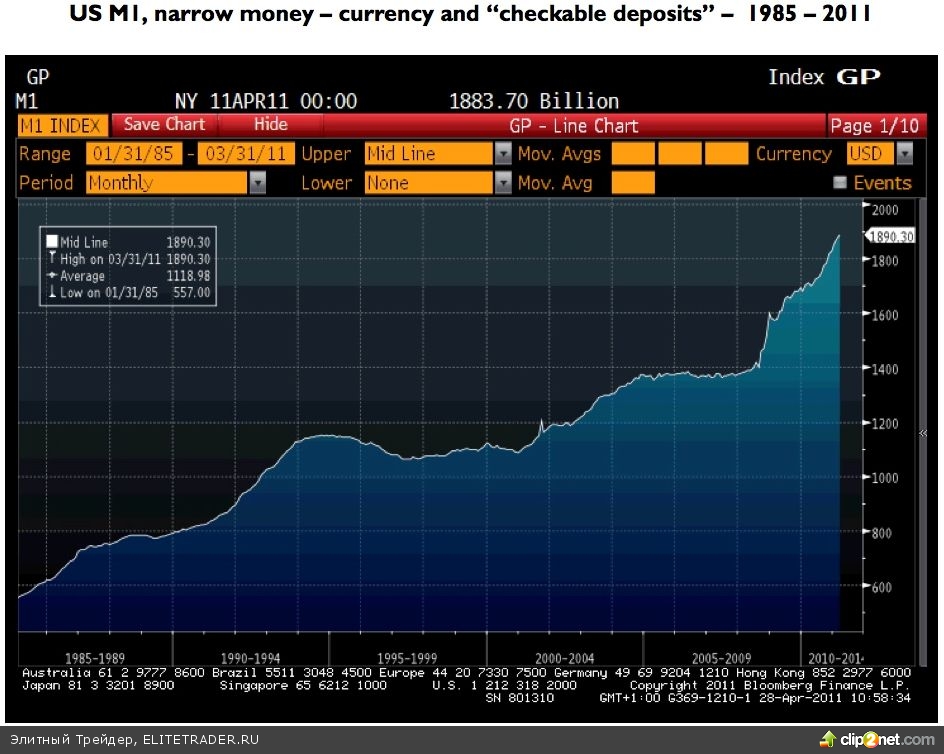 Любой, кто в последние несколько лет имел хоть какое-то отношение к управлению инвестициями, должен усомниться в каждом слове этого смелого утверждения (что интересно, оно преподносится не как цель, а как уже свершившийся факт — то есть миссия не то что невыполнима, она уже успешна выполнена). Можно сказать, что ФРС играет роль центрального банка, но это частный банковский картель и скорее инструмент Уолл-стрит, чем ее хозяин. И если то, что ФРС создает в финансовой системе, называется порядком, как же тогда должен выглядеть хаос? То же самое относится и к стабильности денежной политики. В свете этого, последние заверения ФРС об инфляции кажутся уже не просто сомнительными, а откровенно сюрреалистичными. Представив инфляцию не как размытое понятие, легко манипулируемый инструмент по измерению роста цен, постоянно настраиваемый осторожным действиями ФРС, а как увеличение денежной базы, мы получим следующий график (денежный агрегат М1, $ млрд):