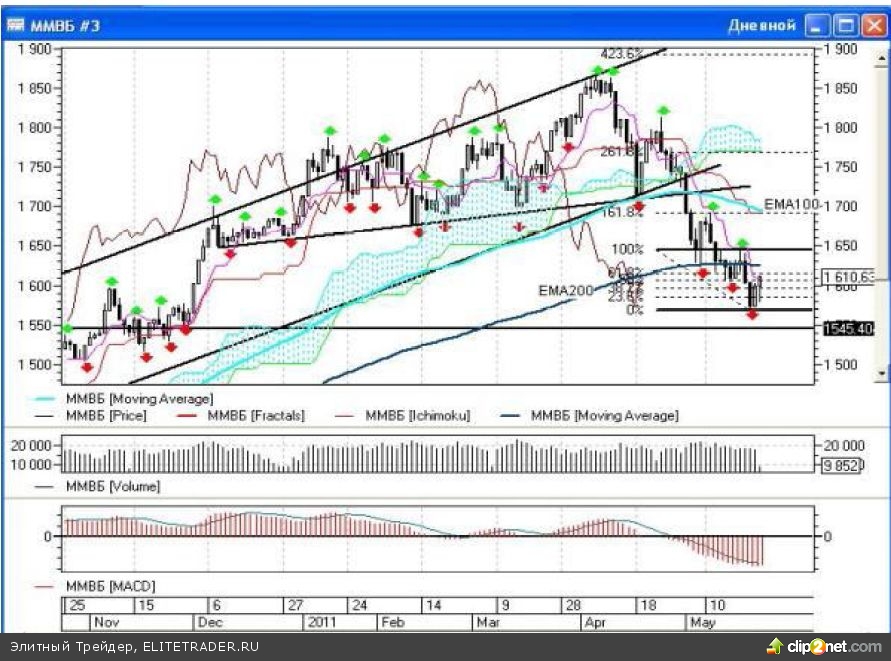 На ее уровне сейчас сформировался дневной фрактал на продажу, близлежащий дневной фрактал на покупку появился на отметке 1647,03 пунктов, 61,8% уровень коррекции по Фибоначчи между этими точками указывает на уровень 1617,45 пунктов. А это значит, что поднимись индекс ММВБ выше данного уровня, он получит все перспективы к продолжению роста в районы 100% и 161,8% уровней. Последний указывает на отметку 1694,87 пунктов, почти рядом с данным уровнем на уровне 1690 пунктов проходит медленная скользящая средняя ЕМА100 на днях, которая также выступает как будущий ориентир. Так что сложиться все может неожиданным образом, надо дождаться только закрытия дня