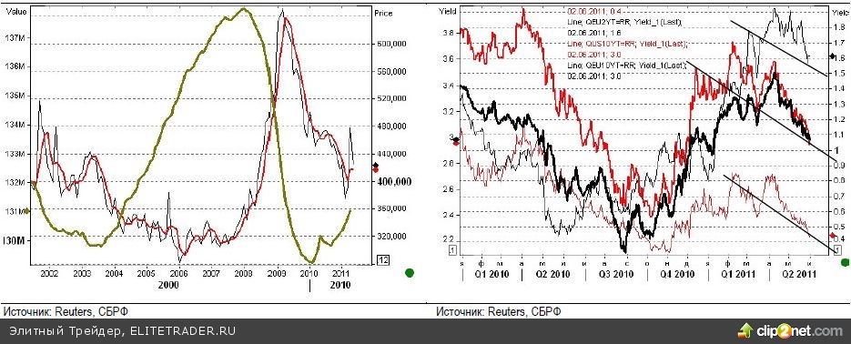 Число рабочих мест вне сельского хозяйства, миллионов (зеленым) и требования первоначальных страховок по безработице (красным - 4-х недельная средняя). Вслед за вторым дном на рынке жилья наступает новая рецессия на рынке труда? В любом случае, до нормальной занятости очень далеко. На этом фоне и процесс нормализации жизненно-важной для мировой экономики кривой на графике выше (долг в числителе к доходам домохозяйств в знаменателе) неизбежно замедляется! Доходность облигаций Trys (10 лет - красная толстая линия, 2 года - красная тонкая линия) и Bunds (те же условные обозначения, черным). Логика поведения этих инструментов более чем очевидна. Тут есть определенное везение Т.Гайтнера... Незамеченным остается сопротивление республиканского парламента США поднятию долгового "потолка" Минфина Штатов, а также более чем острые дебаты по поводу дальнейшей денежной и бюджетной эмиссии: так, недавно 150 экономистов подписали письмо Б.Обаме о необходимости ужесточения бюджетной политики, а автор знаменитого "правила Тейлора" Дж.Тейлор заявил о необходимости поднять ставку ФРС на уровень 1% - согласно правилу Тейлора, конечно. Мы не раз повторяли: доллару (и Trys) альтернативы нет. Только Bunds, но испуганных инвесторов хватает на все.