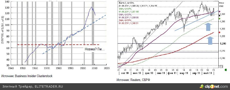 Вы говорили об окончании кризиса? Это невозможно: отношение долга домохозяйств к их располагаемому доходу все еще находится на слишком высоких уровнях, как относительных, так и абсолютных. Кстати, наклонная линия тренда вряд ли тут может рассматриваться как "норма" - речь-то идет об уровне задолженности, а не о доходах или розничных продажах в номинальном выражении! S&P500 - как и американская экономика, пока тормозит, но держится выше точки роста. Это - вторая попытка пробить 50-дневную среднюю; прочие уровни поддержки видны очень ясно.