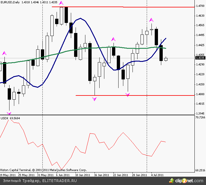 Евро снизился за счет негатива со стороны Moody's в отношении Португалии, но нашел поддержку на 1.43 перед сегодняшним заседанием ЕЦБ и перспективами роста ставки. Однако не исключено, что к концу недели пара сползет ниже, если поводов для оптимизма не прибавится.
