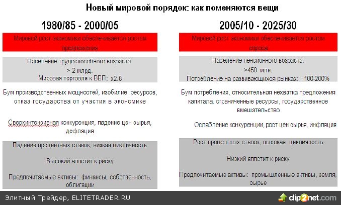 Разве все это не является серьезным намеком на то, что рынок и новые технологии не будут дожидаться роста цены нефти до 300 долларов за баррель (мы тут не имеем в виду гиперинфляцию доллара) и жестокой нехватки металлов? Не было случая в истории, чтобы подлинный рынок, который все еще отличается от китайского, допустил бы серьезного дефицита какого-либо товара надолго. Если можно говорить о некоей антитезе знаменитым "черным лебедям" Н.Талеба, то "белые лебеди", такие, как изобретение процессора 8080, компакт-диска или флэш-памяти, тоже иногда посещают этот мир. Переориентация инвестиций со спекулятивных бумажных активов в технологии и производства должна стать составной частью возникновения нового большого экономического цикла, а "новый мировой порядок", который, впрочем, SocGen тоже считает конечным и ограничивает срок его существования 2035 годом, должен быть всего лишь новым, пусть и не самым легким этапом в развитии мировой экономики, но не конечной волной. Если кто-либо хочет найти правильную стратегическую или венчурную инвестицию, ему следует искать инвестиции в те отрасли, где а) создаются технологии для замены дефицитных материалов, б) создаются технологии для резкого роста производительности труда, т.к. весь мир через годы будет испытывать недостаток в рабочей силе, а Западу, вероятно, уже очень скоро придется вновь конкурировать с Китаем и всей ЮВА в области материального производства.