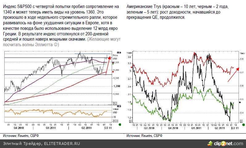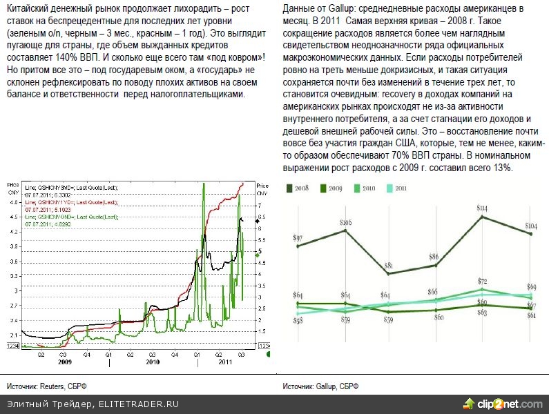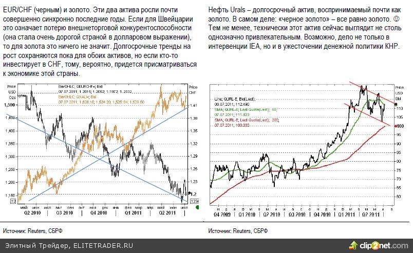 По счастью для Европы, рынки сегодня оказались в приподнятом настроении. Признаки того, что США якобы удается избежать очередного замедления экономики после завершения QE2 - возможно, временные, если игнорировать аргументы ECRI, о которых мы писали ранее, настолько воодушевили участников рынка, что они готовы играть на повышение и в отсутствие новых каждодневных массированных вливаний ликвидности от ФРС. Небольшое улучшение на рынке труда, неплохие данные по индексу ISM manufacturing (ISM non-manufacturing, напротив, был хуже ожиданий, что, видимо, говорит о том, что одно из двух показаний являлось one-off - разовым явлением) были с уже знакомым нам воодушевлением встречены рынком. На то они и финансовые рынки, чтобы вести за собой экономику (smile). Вероятно, в преддверие отчетного сезона карта медленного, но улучшения ситуации в экономике будет охотно разыгрываться и дальше. Опять-таки: совершенно понятно, что некоторые активы сегодня могут рассчитывать на более активный приток капитала, и эти активы - вряд ли из Европы и вряд ли из Китая.
