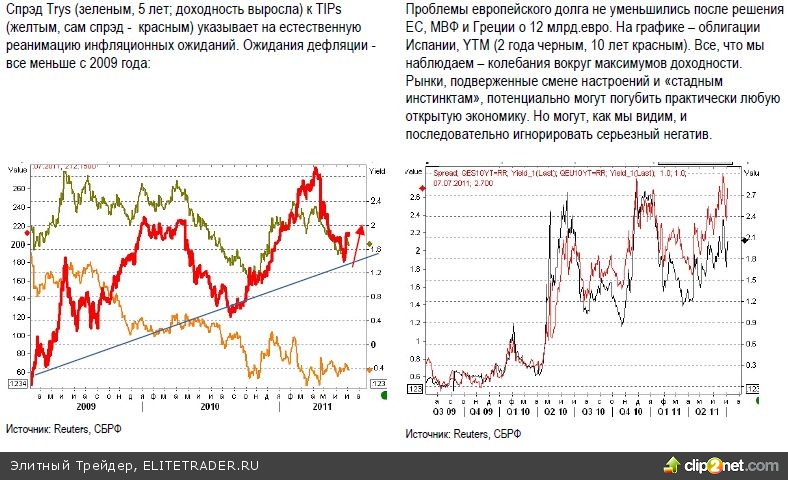 Подъем ставки ЕЦБ до 1.25%, который вызывал некоторое (впрочем, слабое) удивление у части экспертов, остался незамеченным. Из риторики Ж.-К.Трише следовало, что больше подъемов ставки, скорее всего, в этом году не случится, и этого достаточно рынку. Трехмесячный LIBOR EUR и так вышел на уровень 1.4-1.5% уже довольно задолго до решения, а его спрэд с ЕЦБ составляет, таким образом, около 20 б.п., что характерно для периода 2005-2008 гг.