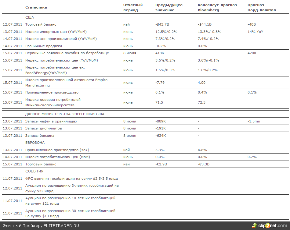 Прошедшая неделя на российском фондовом рынке выдалась довольно волатильной. Сначала отечественные индексы подрастали вслед за мировыми фондовыми и сырьевыми площадками на ожиданиях улучшения ситуации на рынке труда США — доклад от агентства ADP заставлял надеяться, что показатели июняпо занятости будут очень хорошими, однако данные министерства труда за июнь оказались удручающими(число рабочих мест в американской экономике выросло в июне всего на 18 тыс при прогнозах роста на 105тыс, а безработица подскочила до максимума года в 9.2%), в результате чего в конце недели последовалимассовые распродажи на рынках. На следующей неделе дополнительное давление на российский рынокможет оказать выходящая китайская статистика, поскольку данные ожидаются в основном негативные(согласно прогнозам, рост потребительских цен ускорится до 6.2% в годовом выражении, а темпы ростапромышленного производства снизятся с 13.3% до 13.1%). В то же время в понедельник в США начинаетсяотчетный сезон корпоративной отчетности, результаты которого, вероятно, будут более оптимистичны, чтодолжно поддержать котировки акций. Таким образом, российский рынок акций может еще немного просесть,однако впоследствии покупки должны возобновиться, что позволит ему вернуть утраченные позиции.