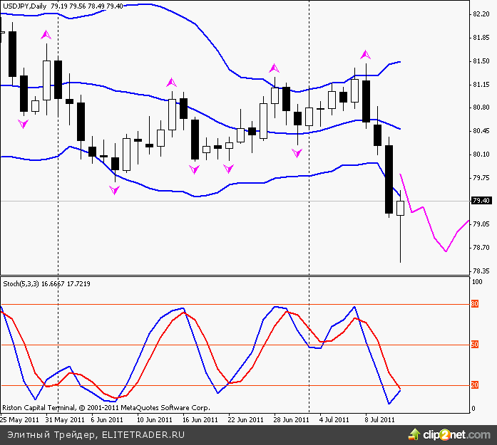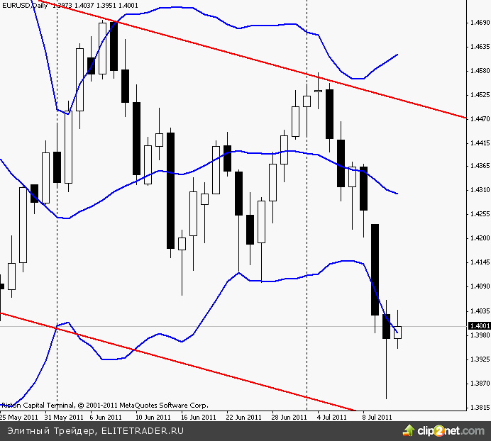 В начале недели ситуация на рынке в какой-то момент начала походить на панические продажи, когда всего за один час, валюты падали на фигуру. Аналитические ленты объяснили ускорение падения евро осторожными заявлениями главы МВФ Кристиан Лагард о том, что “слишком рано обсуждать условия, сроки и объемы” второго пакета помощи Греции. В итоге за два дня этой недели евро падал на 4 фигуры вниз, и на 2 фигуры отскочил, т.е. обвал евро оказался достаточно умеренным. Пара способна падать гораздо интенсивнее, к примеру, 5-ого и 6-ого мая этого года, после того как Трише не произнес слов “высокая бдительность”, евро упал на 6 фигур за два дня, (причем тогда, в отличие от нынешней ситуации, повод к падению был довольно сомнителен). Если где и были панические продажи, так это на долговом рынке Европы. Доходности итальянских 10-леток поднимались до 5.89%, а доходности испанских 10-леток до 6.28%. Италия размещала 6.75 млрд. евро годовых биллей и доходность по ним составила 3.67% против 2.14% на 10 июня, то есть налицо беспрецедентный и угрожающий стабильности бюджета рост стоимости привлечения долга. На таких движениях на рынке европейского долга евро-доллар мог бы упасть и сильнее, тем более, что срабатывание стопов явно помогало движению вниз. Сейчас, правда, ситуация на долговом рынке стабилизировалась, доходности 10-летних итальянских и испанских бумаг откатились до 5.58% и 5.89% соответственно. Однако, думается, разрастание начавшейся тенденции – лишь дело времени. Теперь общий фундаментальный фон и техническая картина такова, что для евро просто не остается других вариантов, как продолжать падение. Хотя глава Еврогруппы Юнкер, и заявил, что “дефолта ни в одной стране Еврозоны не будет” и “решение будет найдено на следующей неделе”, и именно этим объясняется отскок по евро вверх с 1.3850 до 1.40, однако, комментаторы рынков испытывают большой скепсис по поводу того, что “джина удастся засунуть обратно в бутылку”. Доверие к Италии уже значительно подорвано, к примеру, за последние 5 торговых сессий акции банка Unicredit упали на треть. Для тех же игроков, которые в начале июня продали евро против логики и “бдительности” Трише, а также продали евро в начале июля вопреки последовавшему повышению ставки ЕЦБ, падение евро будет хорошей возможностью восполнить потраченные запасы евровой ликвидности.