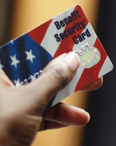 к изображению: Жительница Флориды держит в руках карточку федеральной программы по получению продовольственных талонов. Значительная часть личных доходов американцев поступает от федерального правительства, особенно в штатах Флорида, Мичиган и других, наиболее пострадавших от рецессии.