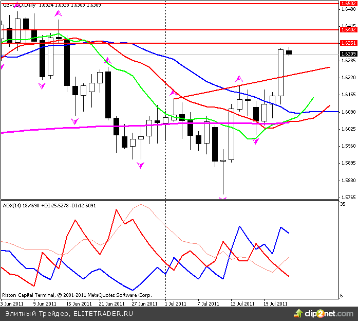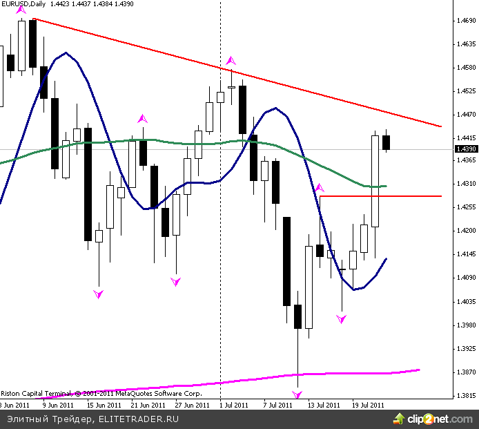 Все долговые обязательства Греции, погашаемые до конца 2019 года, будут конвертированы в 30-летние облигации. Это повлечет за собой выборочный дефолт по долгу Греции, то есть рейтинговые агентства наверняка присвоят рейтинг 'D’ Греции. Однако пока рынки восприняли эти новости позитивно для евро. Доходности итальянских 10-летних бондов упали на 0.2%, до 5.41% (против показанных в понедельник максимумов на 6.03%). Паника начала недели напрочь испарилась. Впрочем, антидолларовые настроения по-прежнему кажутся бесперспективными в ближайшие недели, учитывая, что поднятие порога долга США должно оказать позитивное воздействие на курс доллара.