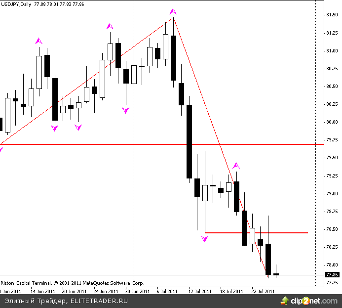 Технически, USD/JPY продолжает падение и минимум еще не сформировался. Можно только предполагать ближайший уровень сопротивления при восходящей коррекции - 78.45.