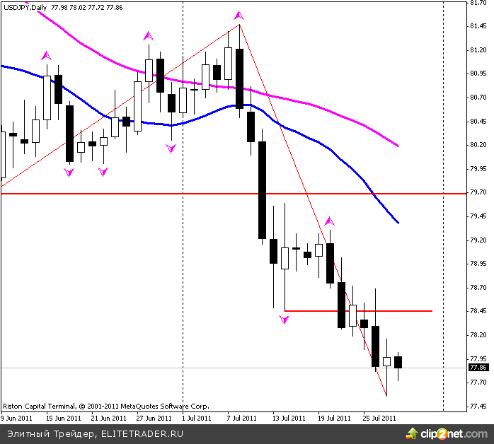 Начало недели проходило под воздействием на рынок форекс ситуации с проблемой разрешения повышения предела государственного долга США, что вылилось в широкомасштабное падение американской валюты по всему спектру рынка, и даже возможный компромисс по этому вопросу не уменьшил вероятность снижение кредитного рейтинга США крупнейшими рейтинговыми агентствами, что поставило бы под угрозу статус доллара США, как основной резервной валюты. Это заставило инвесторов избавляться от американской валюты, покупая всё иное, в том числе высокорискованные активы. Макроэкономическая статистика практически не оказала никакого влияния на ситуацию на рынке forex, так как всё внимание было приковано к проблеме неразрешения (или, как многие эксперты считают, разрешения в самый последний момент) проблемы с потолком государственного долга США. А это - в любом случае - наводнение мировой финансовой системы новой порцией ничем необеспеченной американской валютой. Второй основной валютой, конкурирующей с долларом США, является евро. После эйфории саммита ЕС и общей слабостью в первую очередь американской валюты, вчера евро упал по всему спектру рынка forex. Долговые проблемы еврозоны снова начали всплывать. Любое высказывание европейских финансовых и политических лидеров может негативно восприниматься участниками финансовых рынков. Так, по словам министра финансов Германии Шойбле, не следует полагать, что один саммит может разрешить кризис еврозоны. Эти замечания обратили внимание на тот факт, что, хотя в последниедни долговые проблемы США оказывали поддержку евро, по-прежнему существует множество рисков для еврозоны, и ни одной реальной причины агрессивно покупать единую европейскую валюту не наблюдается. В результате мы наблюдали очередной обвал евро против других валют. И, сегодня динамику рынка Forex, по всей видимости, продолжат направлять настроения инвесторов по поводу разрешения долговых проблем Европы и США.