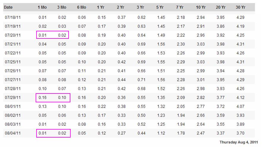 Приведенные ниже таблицы доходности американских казначейских бумаг свидетельствуют о том, что доходность векселей дошла уже практически до нуля.