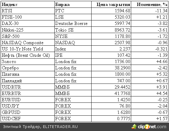 Предвидя худшее, денежные власти Семёрки учинили экстренное совещание по телеконференции – и постановили "принять все необходимые меры для поддержания финансовой стабильности и экономического роста", включая закачку ликвидности на рынки и валютные интервенции. Были мобилизованы и политики по всему миру: европейцы дружно признались в любви к США (особенно усердствовал французский министр финансов Баруан); заместитель Кудрина Сторчак уверил в неизменности российской политики вложений в штатовские казначейки (но по факту с прошлого октября наш портфель облигаций США похудел уже на треть); поддержку Америке выразили японцы с корейцами – и лишь китайцы отреагировали на всё в духе "а мы предупреждали!" Впрочем, это слова, а дела на рынке – штатовское Казначейство разместило длинных бондов на 72 млрд. долларов: спрос был огромен, резко опустив доходности, так что ставка по 10-летним бумагам показала рекордный минимум для первичного рынка (2.14% годовых, ровно в полтора раза ниже предыдущего размещения) – а объём заявок на покупку перекрыл предложение более чем втрое по 2- и 10-летним бумагам; 30-летние, напротив, вызвали малый энтузиазм. Во вторник прошло заседание ФРС США, которое заменило в меморандуме расплывчатый "длительный период" удержания низких ставок на ясный срок "минимум до середины 2013 года" – вызвав всплеск недовольства оппозиции в Фед: сразу три члена правления (Фишер, Плоссер и Кочерлакота) голосовали против этого решения – такое произошло впервые с ноября 1992 года; чтоб смягчить негативный эффект раскола, диссиденты через день публично выразили респект коллегам по ФРС. Центробанки Норвегии и Южной Кореи оставили ставки на месте – и хотя будущие повышения вероятны, пока на рынках паника, ужесточать политику страшновато.