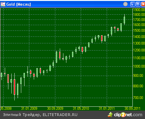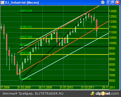 Фондовые рынки. Фондовые биржи в понедельник рухнули максимально с 1 декабря 2008 года; затем пошли дикие колебания – особенно у банков. Bank of America в понедельник обвалился на 20%, во вторник взлетел на 12%, в среду рухнул на 11%, в четверг подскочил на 7%; динамика Citigroup похожа (-16%, +12%, -10%, +6%), полетали J.P.Morgan Chase, Goldman Sachs, Morgan Stanley, Bank of New York Mellon и Wells Fargo. В целом штатовский рынок всего за 2.5 недели целиком отыграл 10-месячный рост – и опустился ниже уровней начала осени 2010 года, когда Бернанке объявлял о грядущем количественном смягчении: многомесячные усилия Фед разрушены за считанные дни; причём объём торгов огромен, превосходя средние числа вдвое – это в августе-то! На графике Доу видно, как индекс около 11400 пробил нижнюю границу восходящего канала, проведённого по ценам закрытия месяцев (и уровень отката Фибоначчи 23.6% от всего роста с кризисных низов 2009 года); теперь под угрозой более широкий канал, построенный по ценовым экстремумам, и уровень коррекции 38.2% - около 10400; если и этот рубеж падёт, то Доу может быстро придти к последнему бастиону (низы летней коррекции прошлого года и уровень отката 50%) в зоне 9500/9700 – ниже вероятен феерический обвал из-за обилия маржин-коллов незадачливых инвесторов, покупавших вблизи недавних верхов.