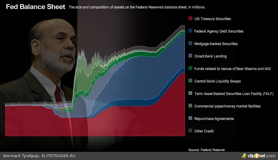 Возможно, что ФРС в случае более тщательного анализа ситуации в экономике, в итоге обратит внимание на указанные «зеленые ростки» и тогда будет принимать окончательное решение по поводу дальнейших действий.В настоящий момент, на балансе ФРС США находится бумаг на сумму в $ 2.85 триллиона, из которых $ 1.5 триллиона долговых бумаг Минфина, и остальные активы, это бумаги связанные с рынком ипотеки, а также некоторые суммы в бумагах связанных с корпоративными именами(Bear Stearns и AIG) и некоторыми программами которые осуществлял Минфин США в период кризиса 2008-2009 годов( в данном случае активы от программы Term Asset-Backed Securities Loan Facility).Поэтому балансовый счет ФРС в любом случае будет оставаться неизменным длительный период времени, что будет означать сохранение избыточного предложения долларов в денежной системе.