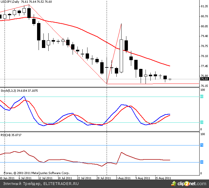 Технически, по USD/JPY по прежнему торгуется в узком диапазоне 76.30 - 77.20 и пока не желает его покидать.