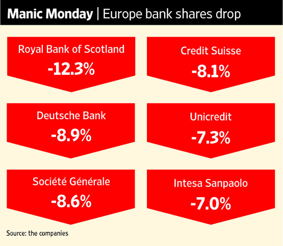 European Bank Shares Slump, Wall Street Journal Проблемные европейские банки получили удар по стоимости своих акций в понедельник, так как инвесторы все более обеспокоены доступом банков к средствам. Опасения в отношении ухудшения данных, судебные разбирательства, давление суверенного долга и потенциальный рост необслуживаемых кредитов внесли свой вклад в опасения, что ликвидность бьет по банковским акциям. В то время как европейские фондовые рынки упали примерно на 5% по всем направлениям в понедельник, акции банков пострадали сильнее. С начала года некоторые европейские банки потеряли треть или более от рыночной капитализации.