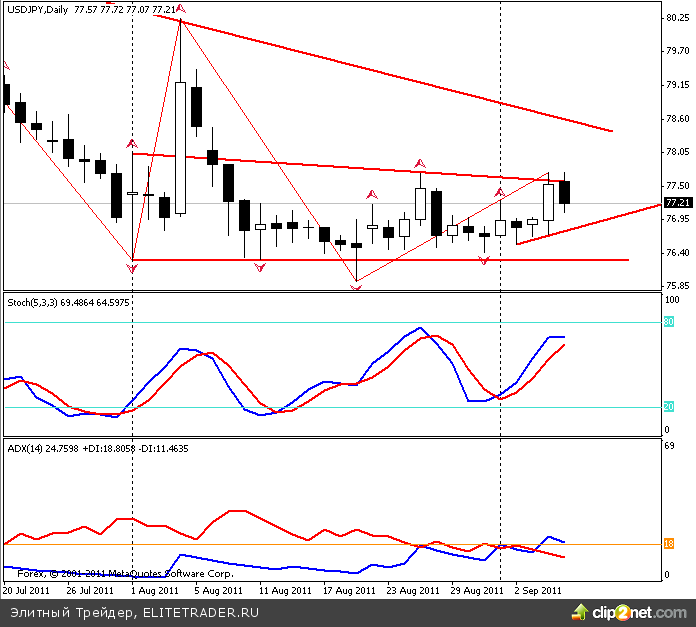 Технически, восходящая коорекция по USD/JPY остановилась на линии сопротивления, которая сейчас проходит около 77.55. Возможно нисходящее движение к линии поддержки - 76.90.
