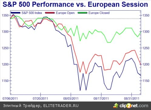 В соответствии с традицией обвинять всегда что-то или кого-то за все (искать крайнего, мальчика для битья), если не делается достаточно как ожидалось, будь то дождь, жара, холод, снег, землетрясения, цунами, взрывы на АЭС, или простые вещи, такие как бывшие президенты, даже если текущий проводит кампанию трудно для избрания на второй срок, сейчас определили единственного виновника обвала рынка: Европа. Как показывает следующий график, существует высокая корреляция между открытием европейского фондового рынка и американскими индексами. Вот только что первично: "курица или яйцо"? Индексы это индикаторы или катализаторы? Тем не менее, зависимость налицо...