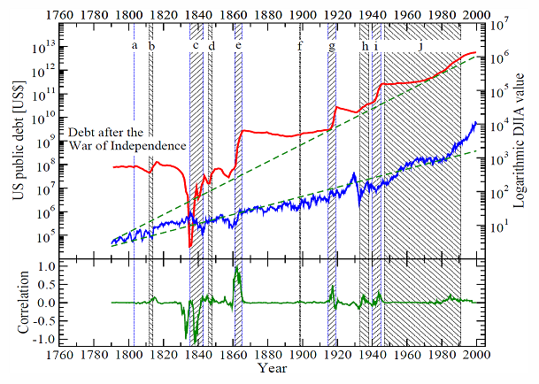 Теперь, когда мы понимаем, как работает экономика, становится ясно, куда мы движемся. Повысить государственный долг? Поднимите DJIA! Эффект постепенного стимулирования экономики должен обогатить нас всех. Обратите внимание на долговые скачки в определенные интервалы – особенно около 1812, 1860, 1914, 1940 и неуклонно после 1965. Эти долговые скачки связаны с войнами, доказывая поговорку Кейнса, что война – это благо для экономики