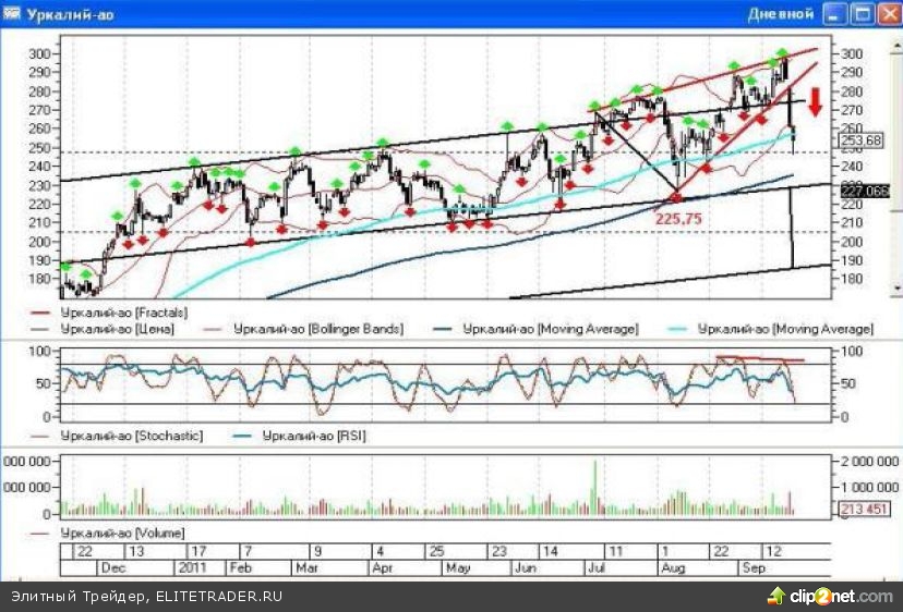 Если вы вспомните мой обзор, то я указывала еще на одну возможную цель снижения, расположенную на уровне нижней границы долгосрочного восходящего тренда. Этой целью является район 230-235 рублей, там же пролегает медленная скользящая средняя ЕМА200 на днях